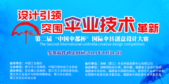 晋江,作为全国最大的伞具出口集散地,是闻名全国的中国伞都。在过去20多年的发展中,晋江市制伞产业取得了举足轻重的成就,但随着伞具产业不断发展与集聚,如何更好地利用好工业设计力量,实现伞具企业的转型与发展,打造特色伞具品牌,推动产品的差异化竞争,成为了晋江伞业企业亟需解决的难题。为进一步推动晋江伞具行业的转型与发展,实现用工业设计力量拉动企业转型与创新,推进差异化竞争,通过征集一批具有独特创意与市场潜在价值的伞具设计作品,为晋江伞具行业发展注入新鲜力量,激发、开拓行业潜在市场,帮助规避企业同质化竞争,实现晋江伞具价值的新突破,现拟举办第二届中国“伞都杯”国际伞具创意设计大赛,具体活动方案如下: