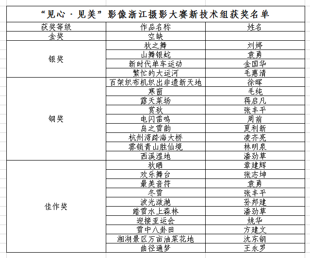 根据大赛参赛规则第4条、第5条、第6条规定,经过浙江省摄影家协会相关专家评审和组委会复核,现将本次大赛获奖名单进行公示。本届大赛特等奖和新技术组金奖作品空缺。公示时间为期3天,面向社会接受公开监督,如有违反相关规则的参赛作品,请联系大赛组委会。(联系电话:0571-81089789)