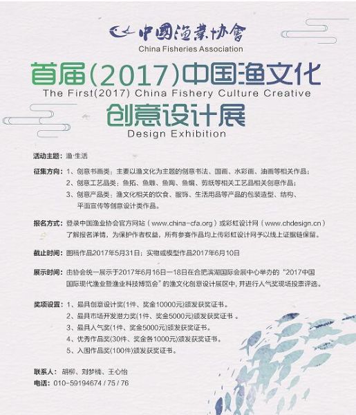 近日,中国渔业协会发布了中渔协[2017]19号文件,关于开展“首届(2017)中国渔文化创意设计展”作品征集的通知,活动以“渔·生活”为主题,旨在征集具有渔文化特色和市场开发价值的产品,发现一批设计领域的优秀人才、设计机构、文创企业,激励文化企业开拓渔业新领域、培育新市场,通过比赛与展览、展示相结合的方式,打造国内渔文化创意设计的专属平台。