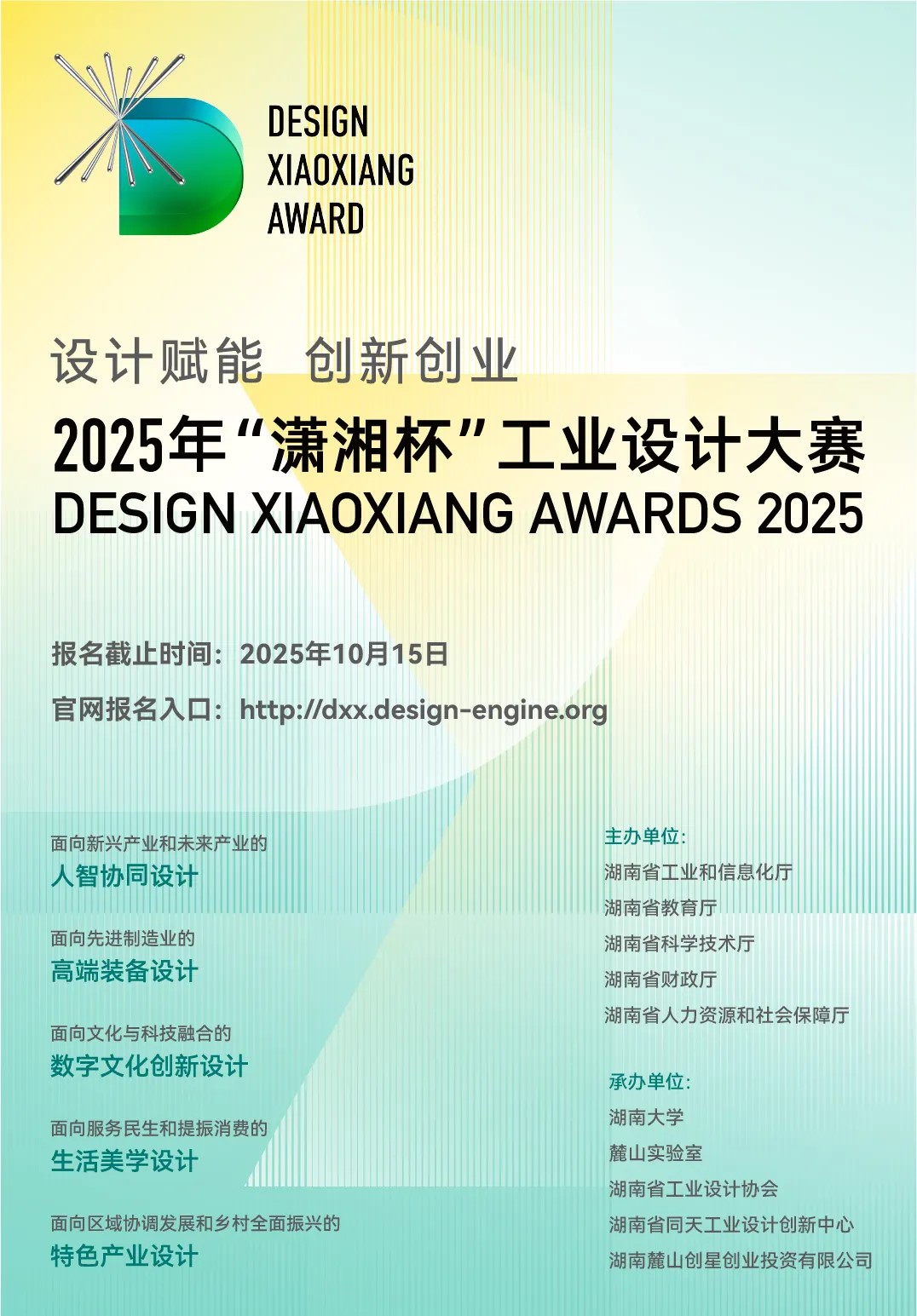 2025年“潇湘杯”工业设计大赛作品全国征集中。即日起参赛者可通过大赛官方网站(http://dxx.design-engine.org)报名投稿,作品投稿截止时间为2025年10月15日,欢迎参赛者踊跃报名参赛。