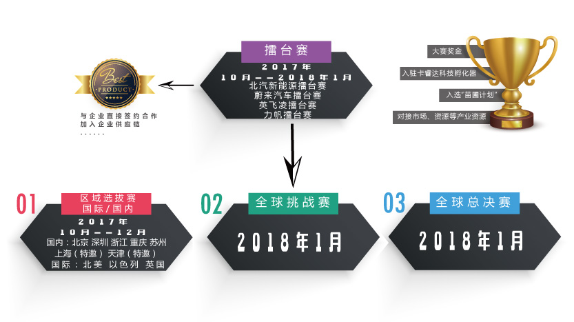 此外,为了更好地解决创业项目产业化难的痛点,促进创业项目与整车厂、零部件企业等的深入对接与合作,充分务实地展现项目的创新性、实用性和商业价值,大赛组委会创新性地在中国创新创业大赛之国际新能源及智能汽车大赛的主线条赛事之外,增设擂台赛。擂台赛的主题由擂主企业(结合其重点产品、技术需求或产业规划等)与大赛组委会共同设计确定,参赛团队可结合项目的属性和特点同时申报主线条赛事和擂台赛。擂台赛获胜的项目团队将获得与命题企业直接合作的机会。