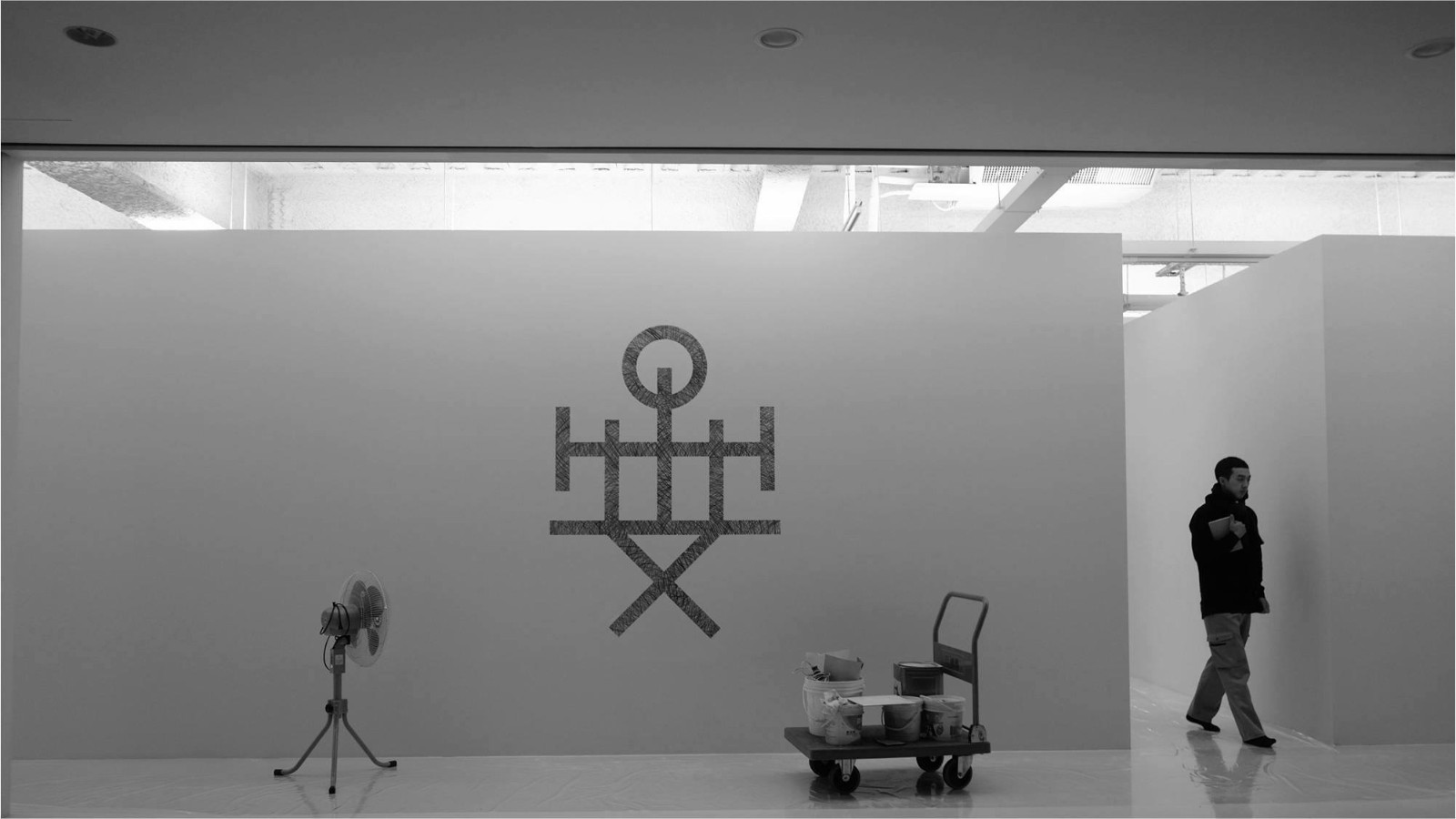 安尚秀为这次展览设计的新符号:新符号将代表「平安」、「舒适」的汉字中的「安」与「文字」的甲骨文原型组合设计而成。这三个汉字的组合,就像坐在某个空间里,而这样的空间像是一个「家」。 「家」的部首就像是祭祀神灵,并于寺庙或者宇宙进行情感交流。新设计的符号,呈现一位住在屋檐下被保护的人,想要冲破牢笼,掀翻屋顶的瓦片,跨越天空,并渴望与世界进行精神互动。