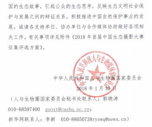 2018年是中国加入联合国教科文组织“人与生物圈计划”45周年,也是人与生物圈国家委员会成立40周年,中国人与生物圈国家委员会联合新华网、中国世界生物圈保护区以及相关单位、媒体,以“弘扬生态文化为宗旨,用生态摄影理念为指导”启动首届中国生态摄影大赛,面向社会公开征集反映中国自然保护区,尤其是中国生物圈保护区网络成员单位的自然景观、生物多样性、人与自然关系的摄影和摄像类作品。