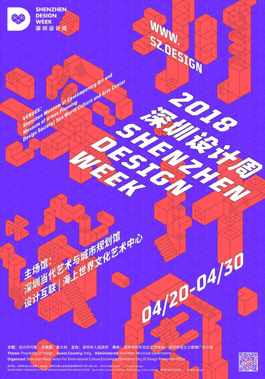 深圳设计周将于2018年4月20日至4月30日在深圳设计互联|海上世界文化艺术中心与深圳当代艺术与城市规划馆举行。本届设计周以“设计的可能”为主题,旨在强调设计与产业、设计与社会生活的相互关系及影响,它将不再只是一个单纯的展示交流的设计活动,而是跨国界地将国际一流的设计师和设计作品引入深圳,也让更多的人了解深圳设计,打造“深圳设计”品牌,同时加强公众对设计的认知能力,让设计真正融入生活、改变生活。