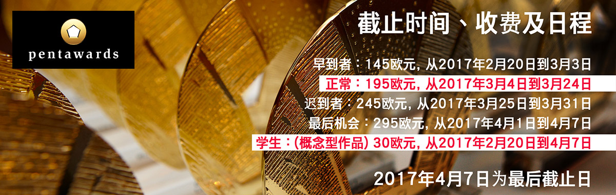 通知所获得的 Pentaward 奖项:最迟于 2017 年 6 月 30 日以电子邮件形式发送至注册时提供的地址(此信息在正式颁奖典礼前为保密)。