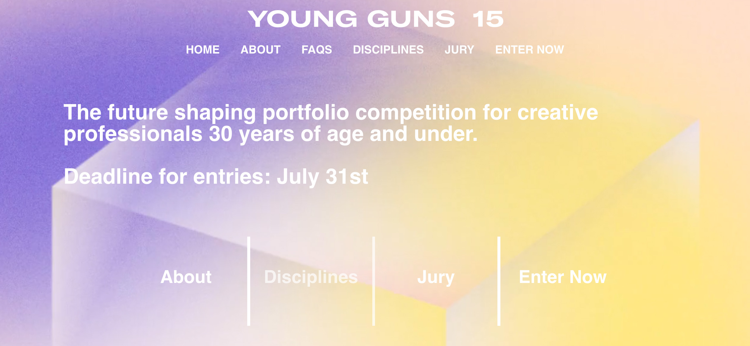 Young Guns国际青年设计大奖是业界唯一以参赛者现有作品集为基础进行评审的国际青年设计奖项,每年吸引来自全球超过70个国家的年轻设计师参与。所有参赛作品将由国际顶尖创意大师及往年的获奖者进行评审,评审名单将于之后在Young Guns官网进行公布。